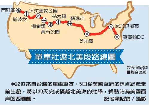 22名來自台灣的單車車友,在華府30多度的高溫下,穿著印有中華民國國旗的制服,魚貫的從林肯記念堂前出發,展開39天,近7000公里的橫跨美國之旅。